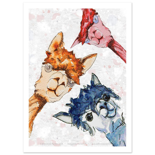 A cheerful collection of alpaca fusion posters with a soft semi-gloss finish — bright, characterful, and easy to hang anywhere. Printed on high-quality classic paper, they’re an affordable way to enjoy Instinctively Random art at home.